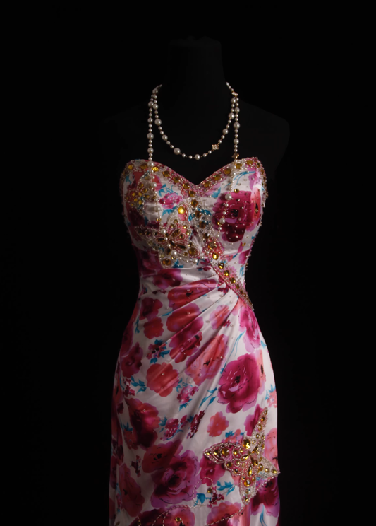 Vintage Pink Floral Beaded Sweetheart Strapless Mermaid Prom Dress TP5679