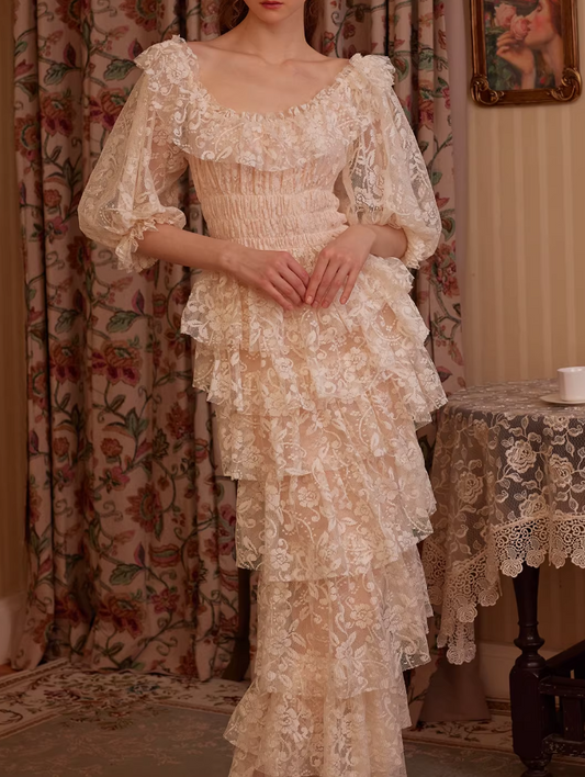 Vintage Cream Satin Midi Prom Dress Lace Corset & Puffed Sleeves Evening Gown TP5692