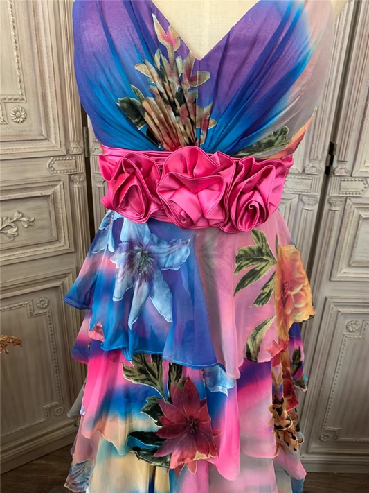 Luxury Multicolor Floral Print Evening Gown Tiered Chiffon Prom Dress TP5678