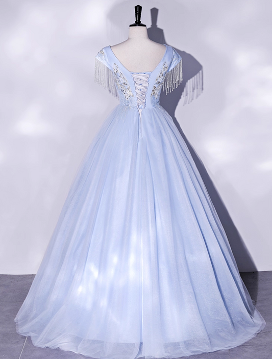 Vintage Sky Blue Tulle Beaded A-Line Evening Gown V-neck Cap Sleeves Party Dress Long Formal Dress TP4957