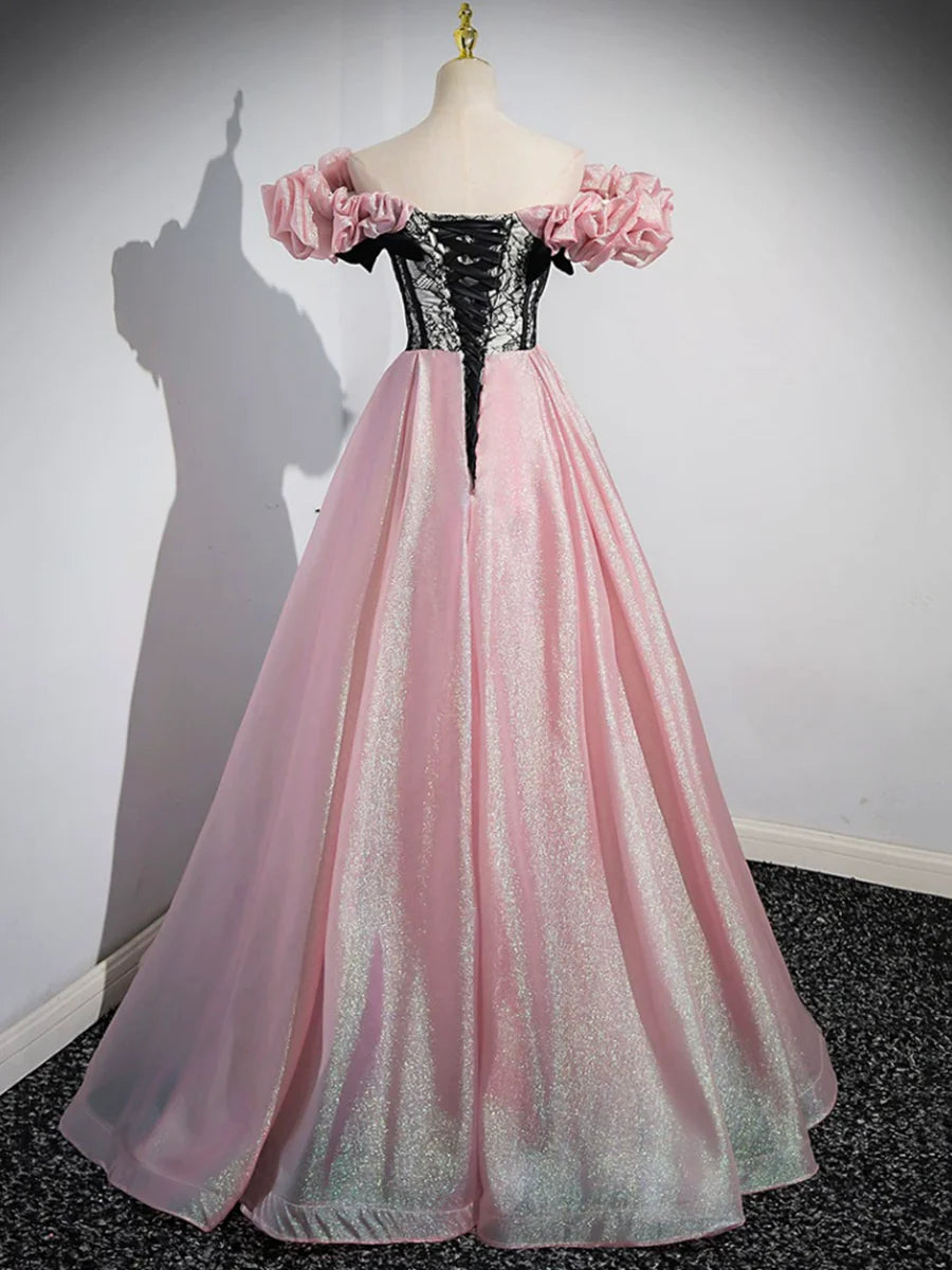 A-Line Shiny Tulle Long Pink Corset Prom Dress, Off the Shoulder Pink Evening Dress TP294