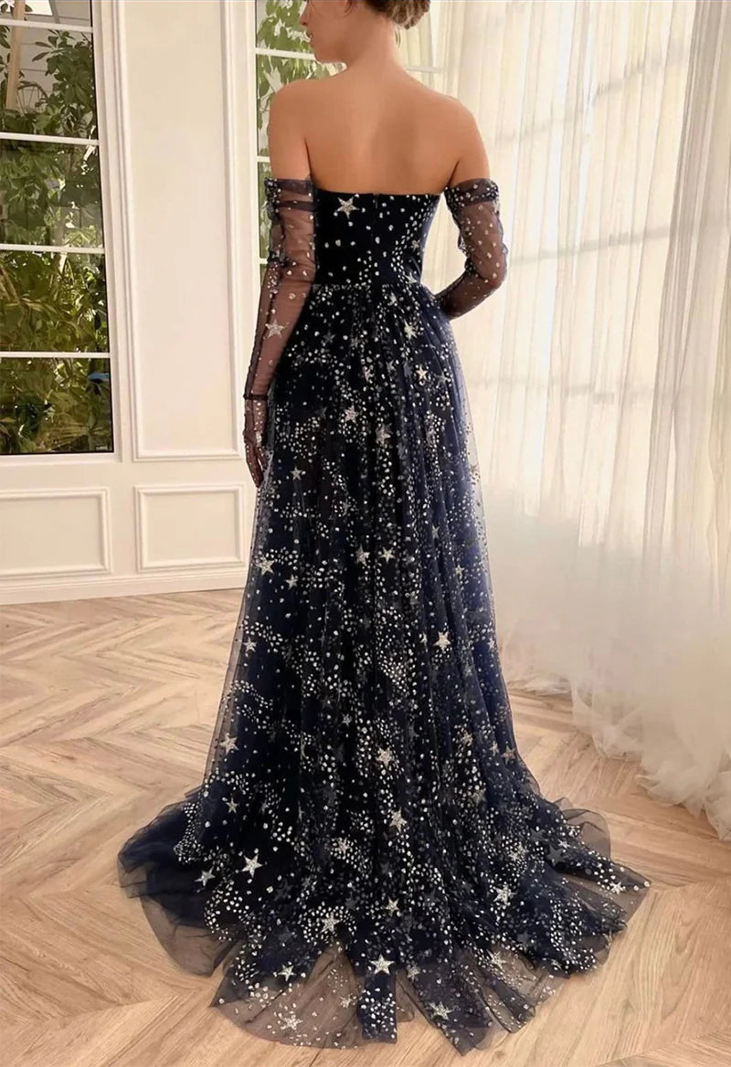 A-Line Tulle Dark Blue Long Prom Dress, Dark Blue Formal Dress TP47