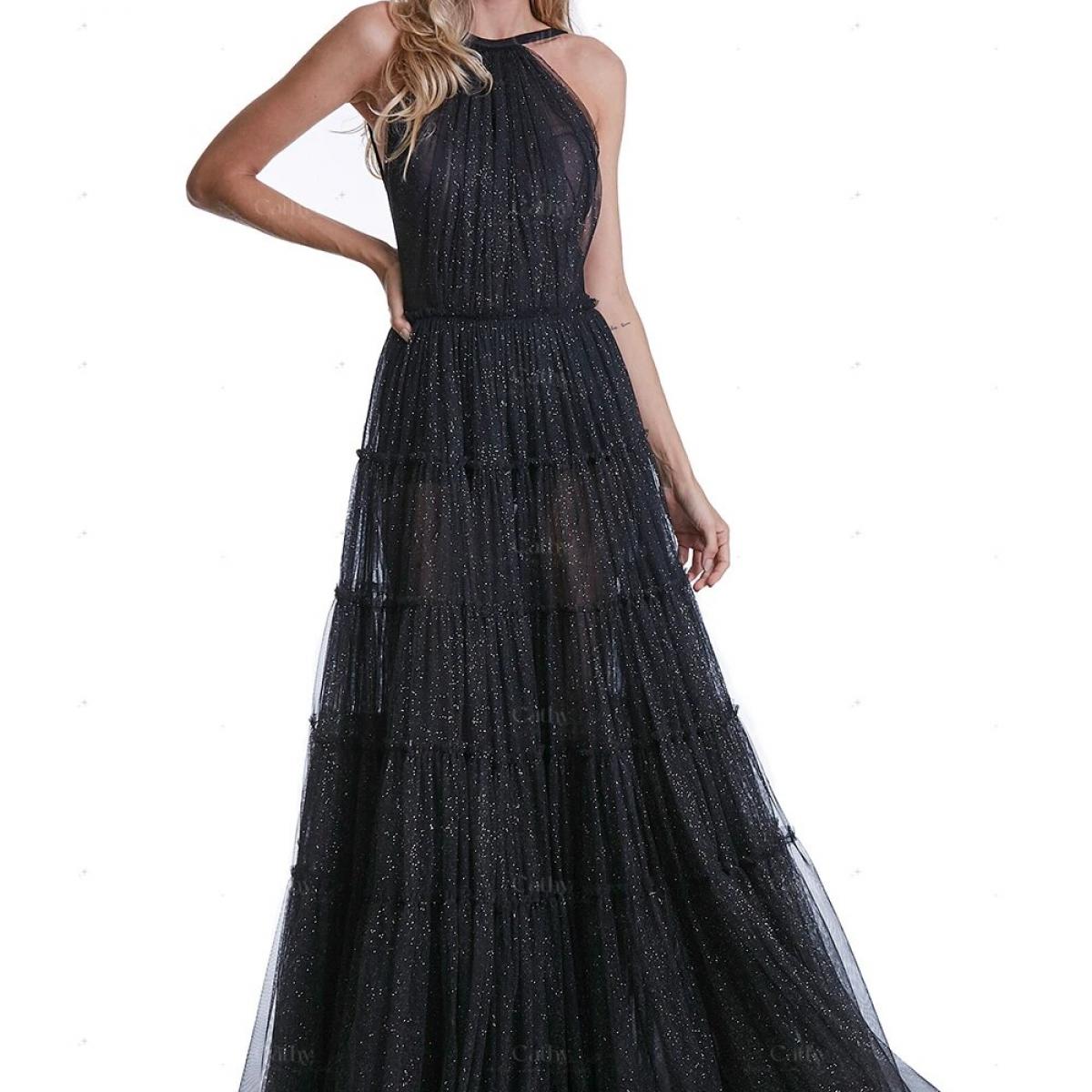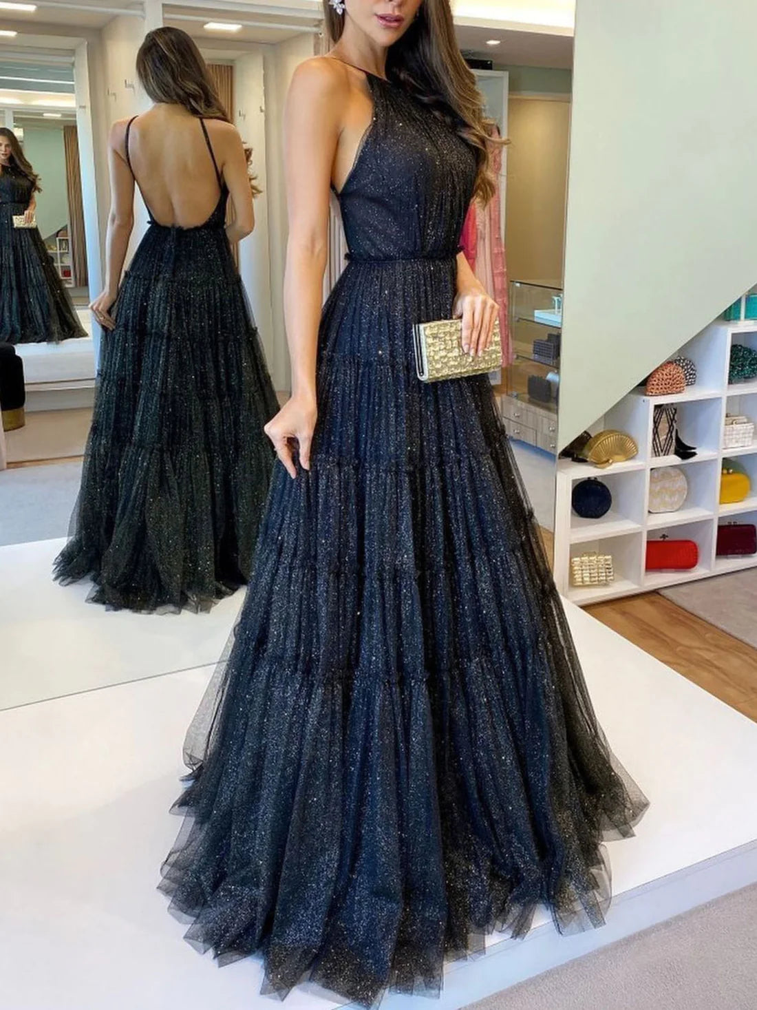 Black A-line tulle long prom dress black tulle formal party dress TP39