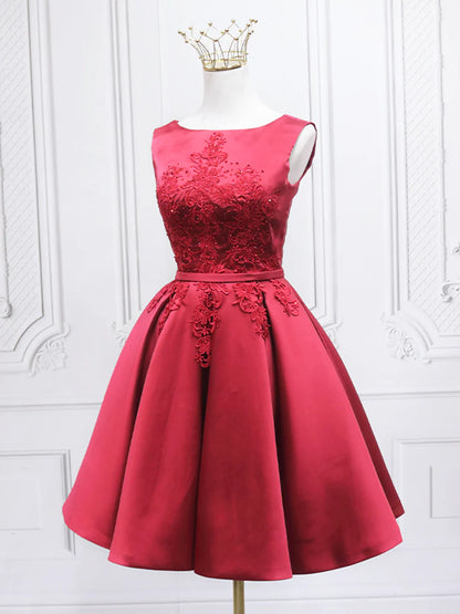Burgundy Satin Lace Short Prom Dress, A-Line Homecoming Dress TP867