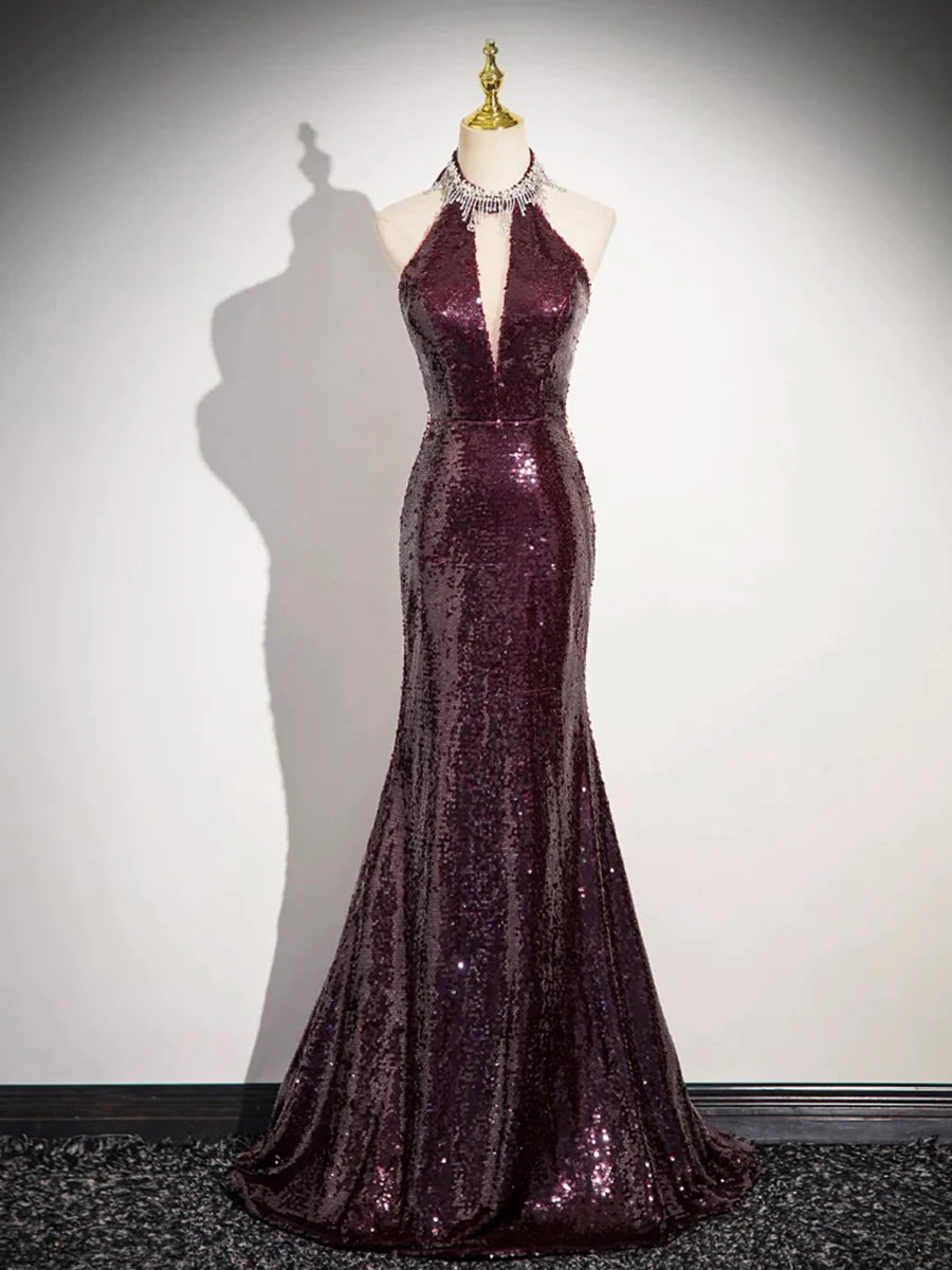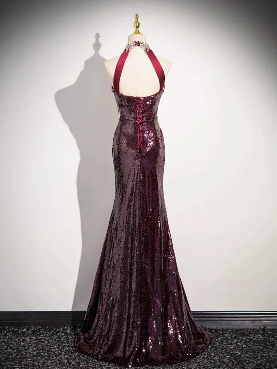 Burgundy Sequins Long Prom Dress, Mermaid Backless Evening Formal Dress TP111