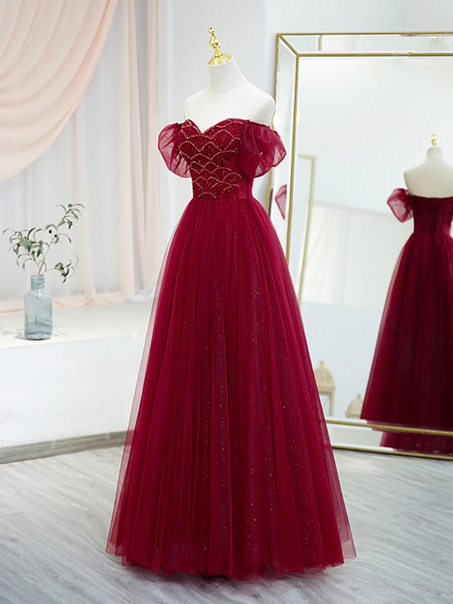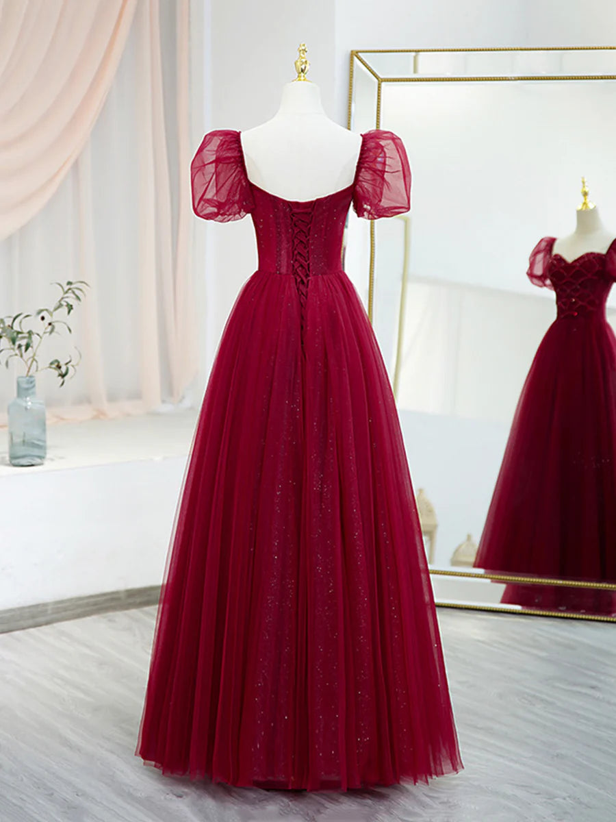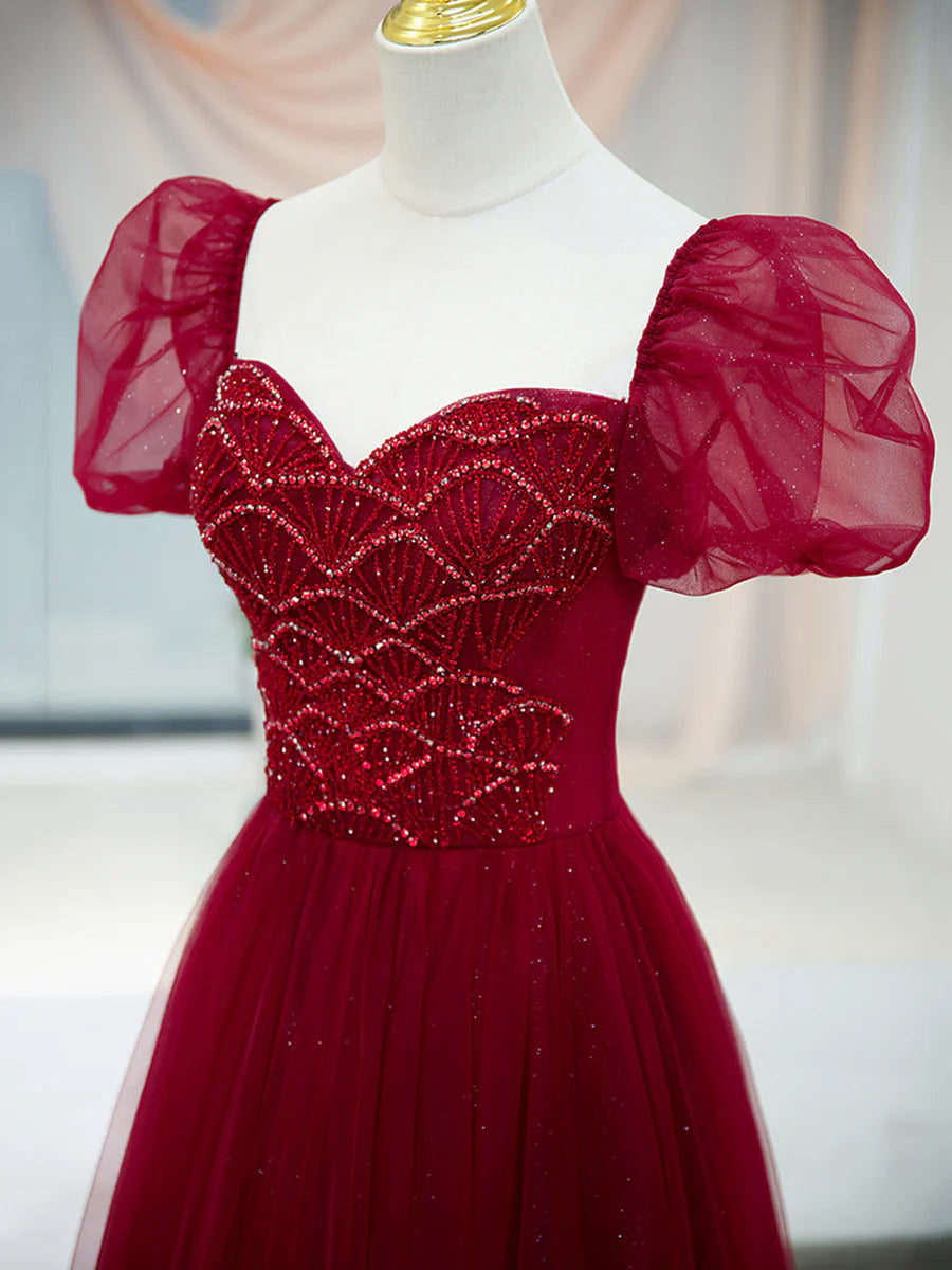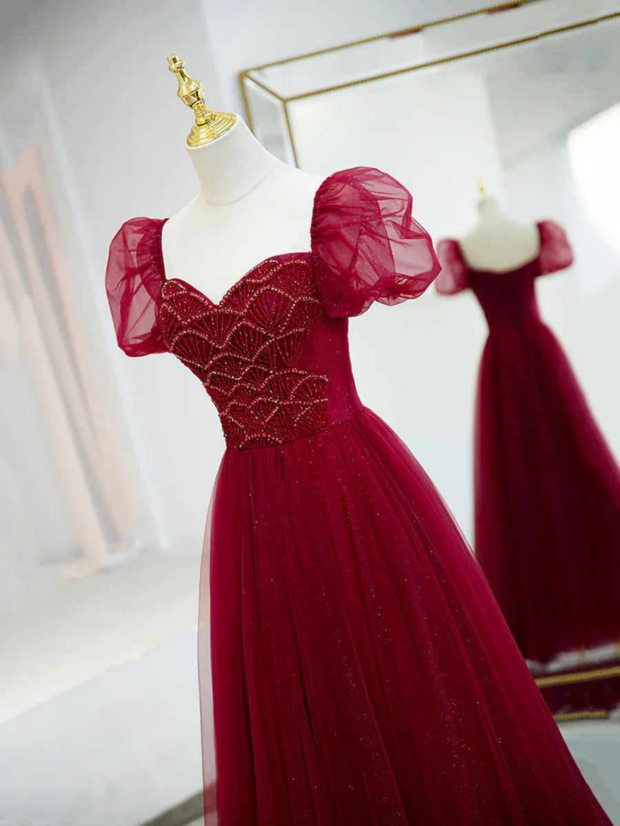Burgundy Tulle Beaded Long Prom Dress, A-Line Short Sleeve Evening Dress TP440