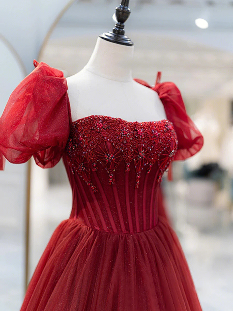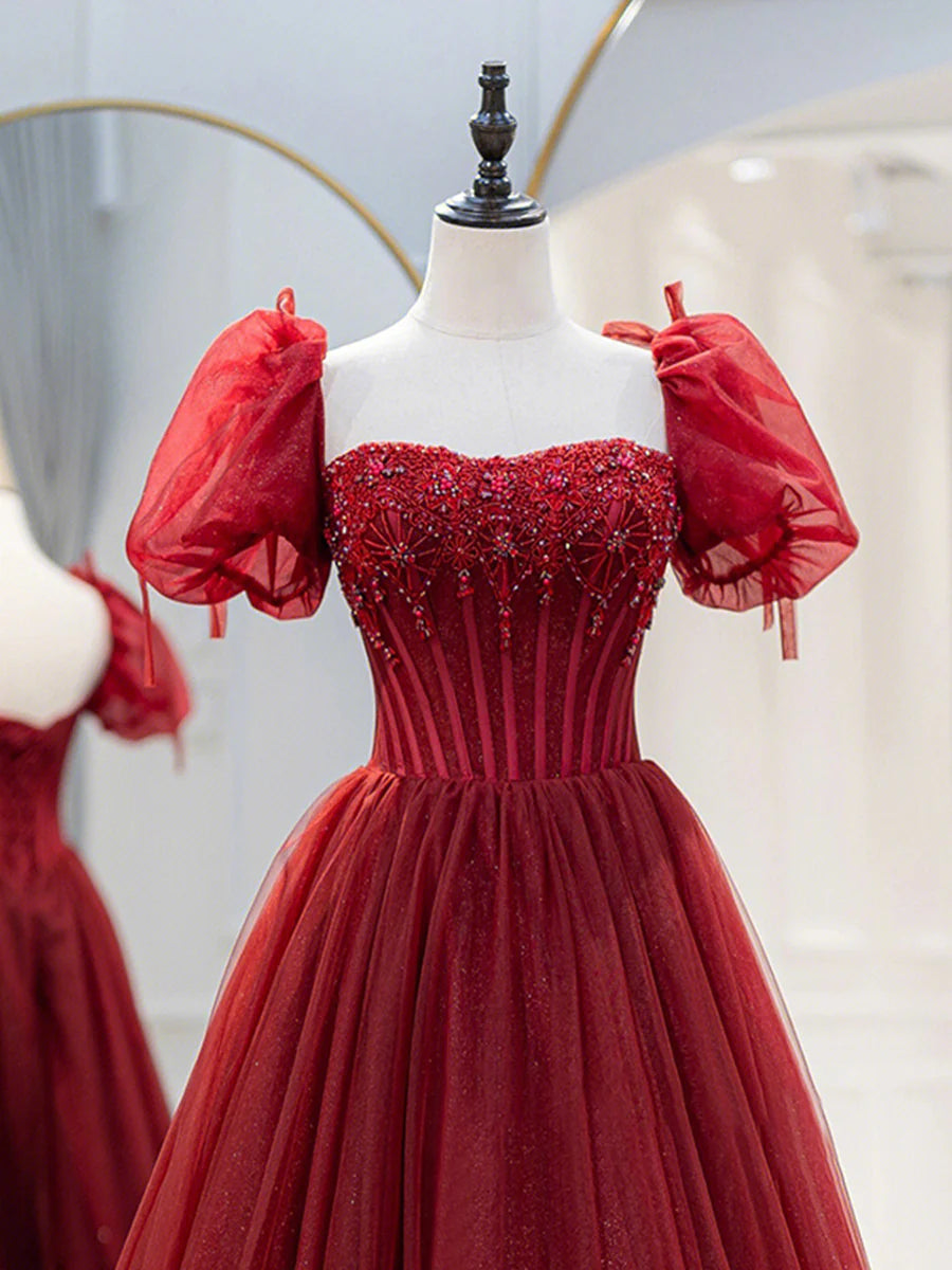 Burgundy Tulle Beaded Long Prom Dress, A-Line Short Sleeve Evening Dress TP446