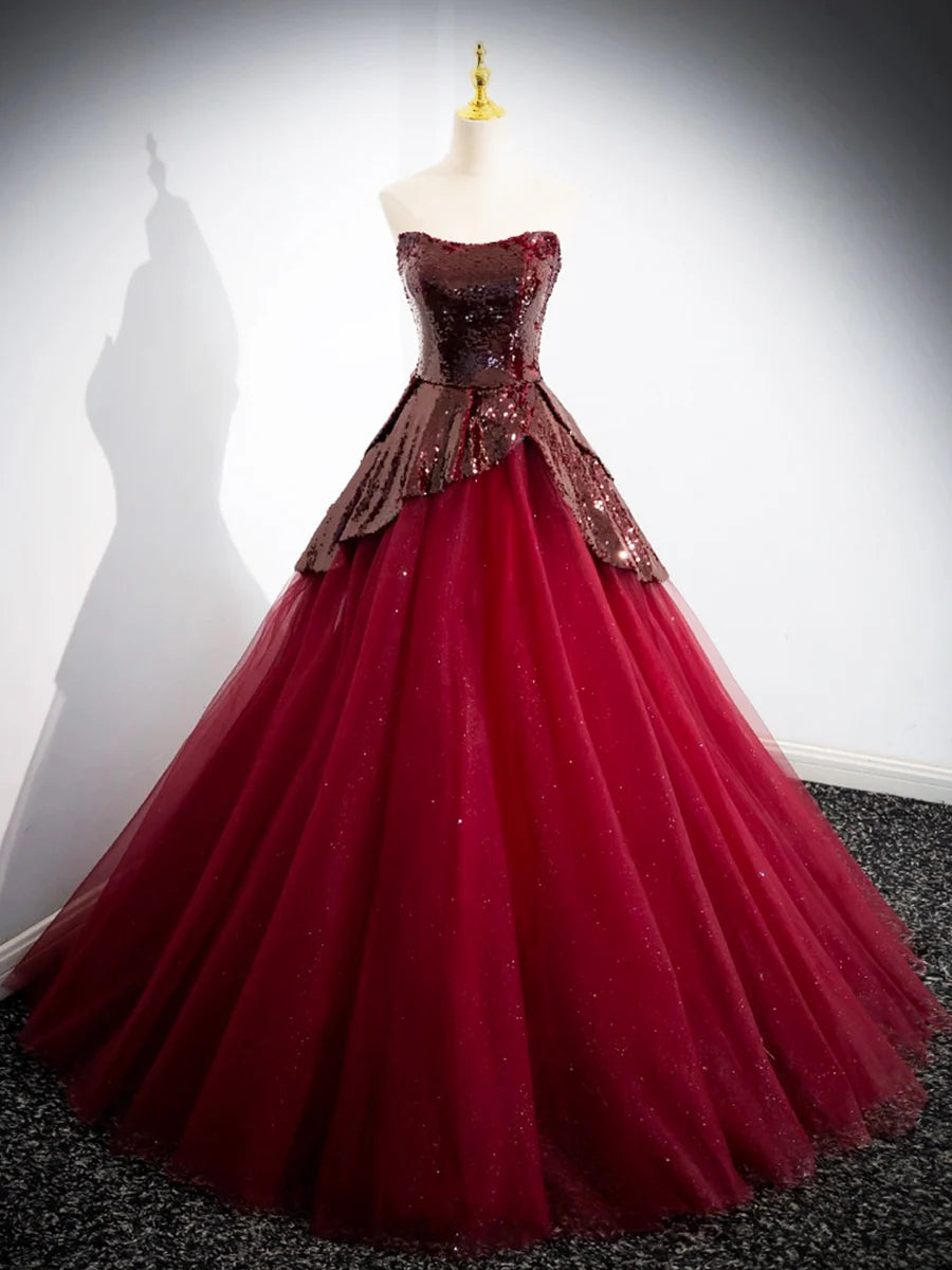 Burgundy Tulle Sequins Floor Length Prom Dress, Off the Shoulder Formal Evening Dress TP180