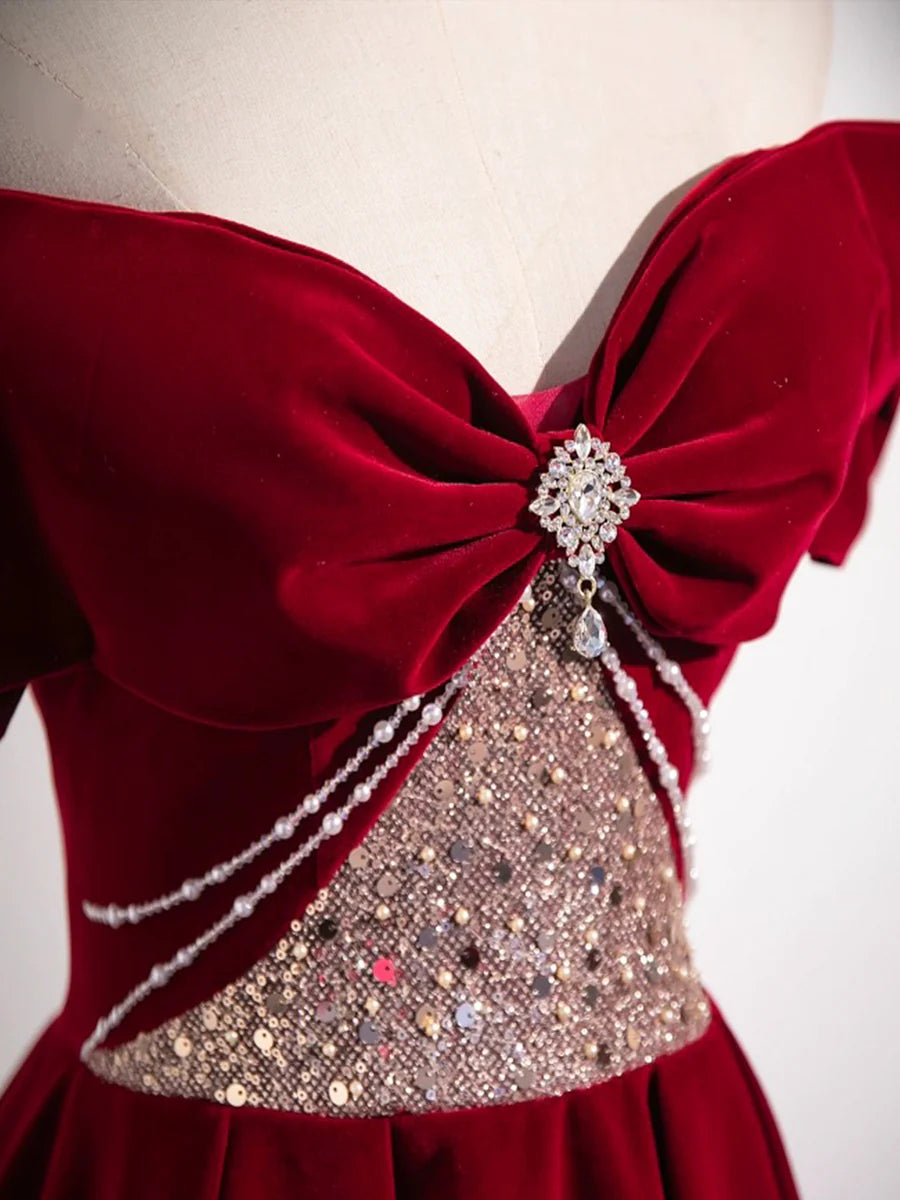 Burgundy Velvet Sequins Long Prom Dress, Elegant Off the Shoulder A-Line Formal Dress TP179