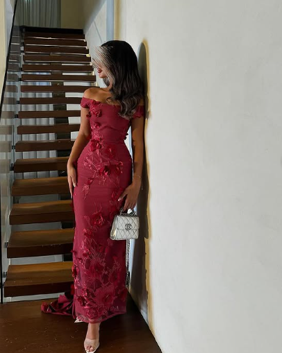 Elegant Burgundy Mermaid Off Shoulder 3D Floral Floor-Mounting Ball Gown Evening Dress TP2005