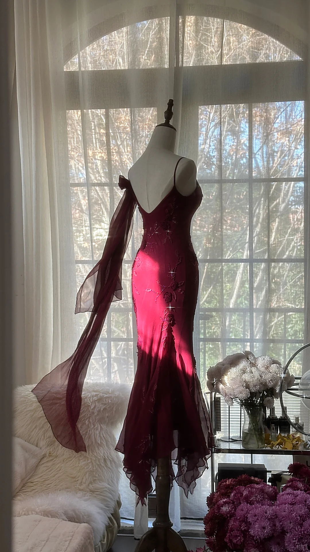 Elegant Burgundy Spaghetti Strap Gorgeous Beaded Sparkling Chiffon Evening Dress Prom Dres TP3973