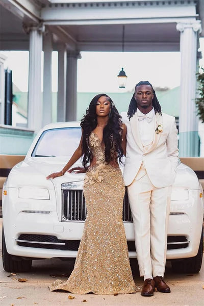 Elegant Champagne Beaded Applique Mermaid V-Neck High Slit Evening Gown Prom Dress TP5228