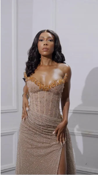 Enchanting Shiny Champagne Beaded Strapless Slit Prom Dress Evening Dress TP4330