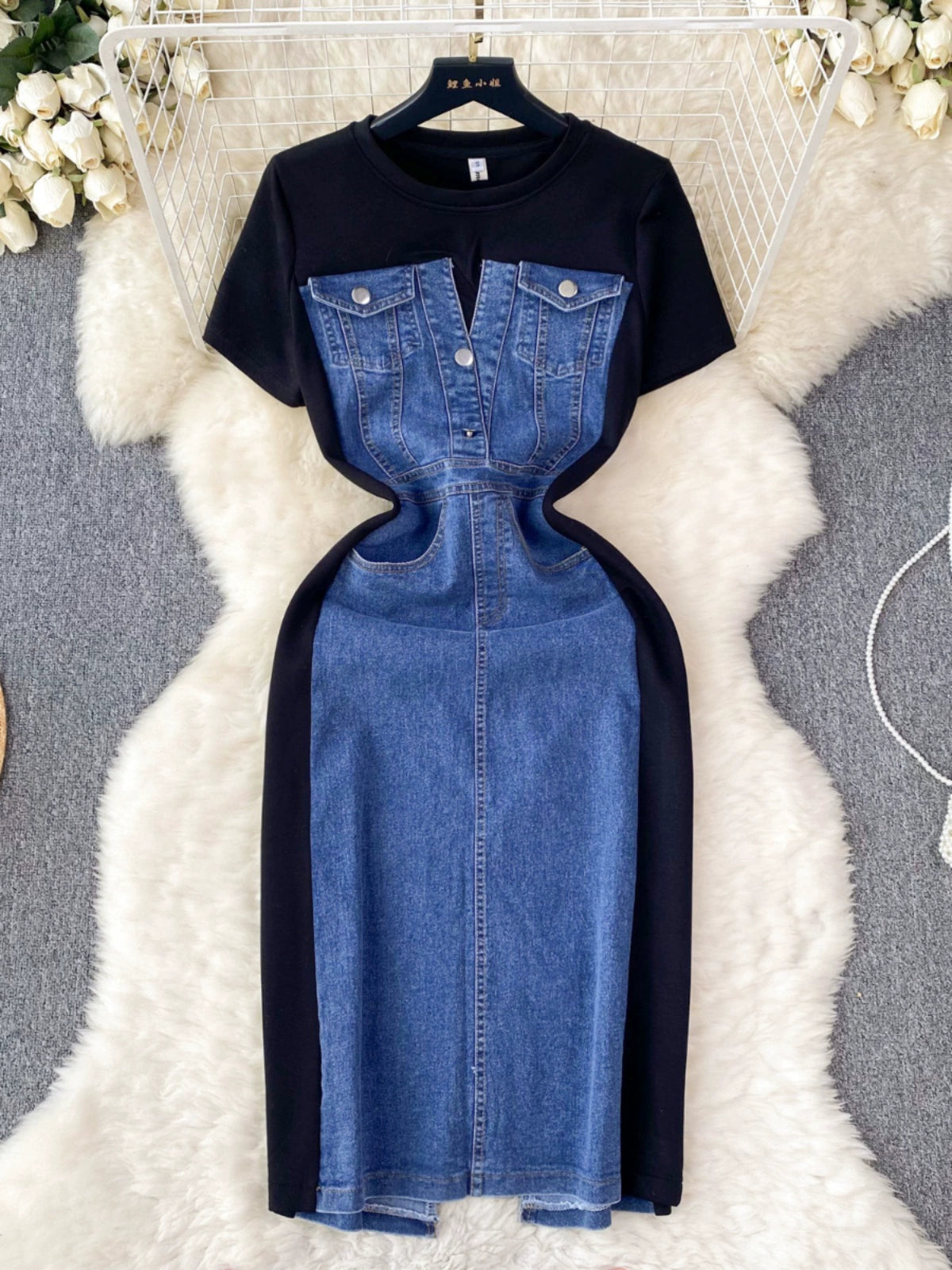 Fashion Design Sense Crew Neck Short Sleeve Patchwork Denim Dress TP2829