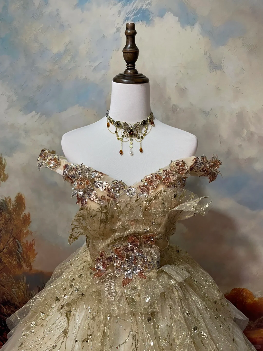 Glamorous Champagne Gold Sequin Off-Shoulder Beaded Tiered Tulle Sweet 15 Quinceanera Ball Gown TP5459