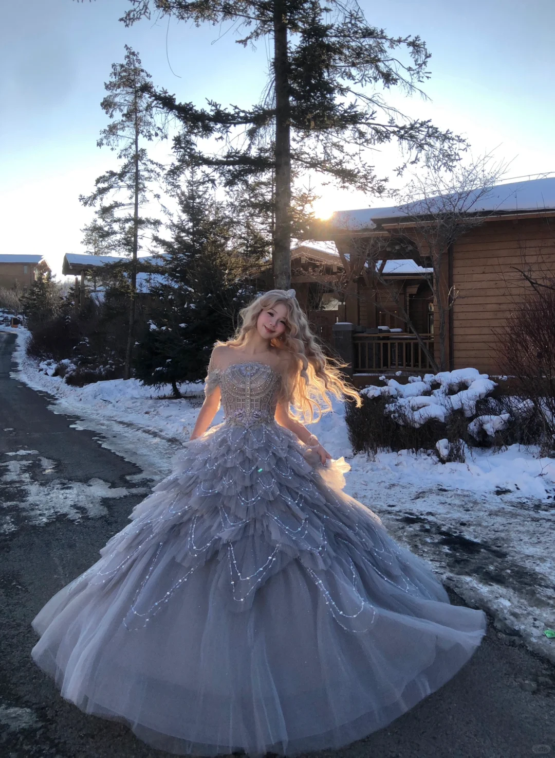 Gorgeous Glittering Sequined Beaded Off-the-shoulder Tulle Sweet 16 Quinceanera A-Line Evening Dress Ball Gown TP4299