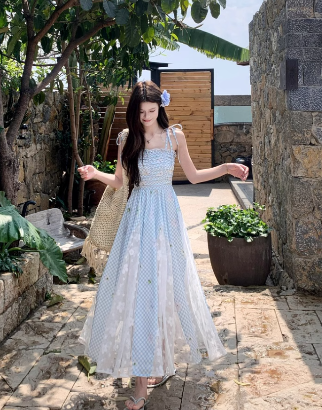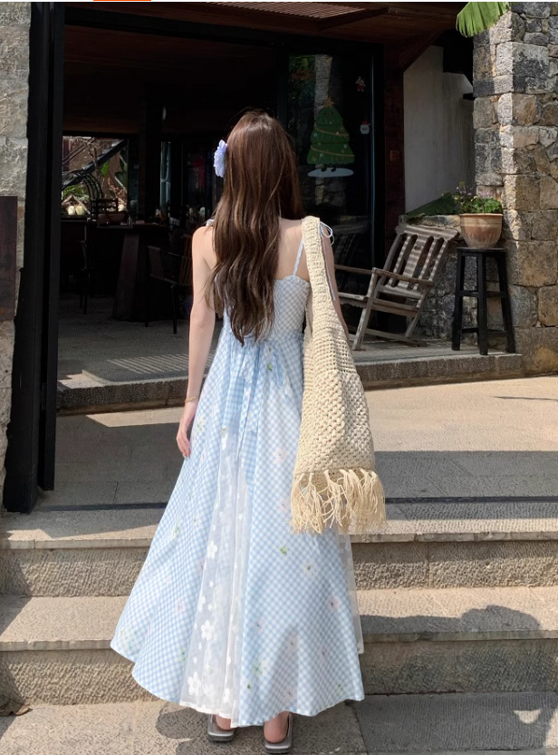 New Fashion Blue Plaid Design Beach Holiday A-line Sleeveless Spaghetti Strap Dress TP3319