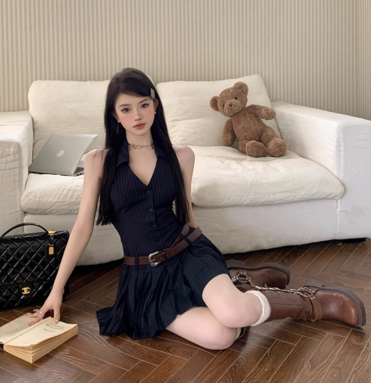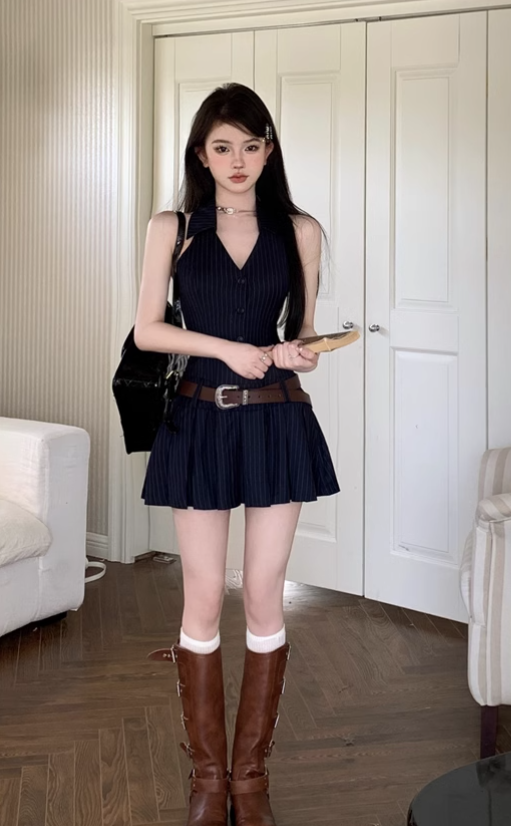 Simple Navy Blue Striped Design V-neck A-line Halter Dress TP3314