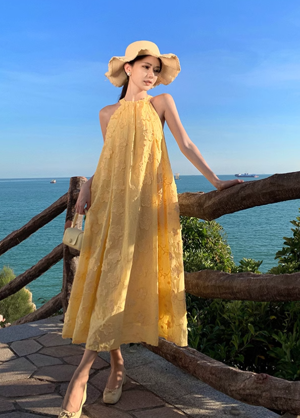 Simple Fashion Women Yellow Floral Design A-Line Halter Dress TP3087