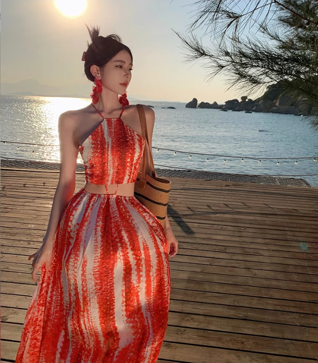 Bohemian Style Women Unique Design Sense Red A-Line Halter Dress TP3081