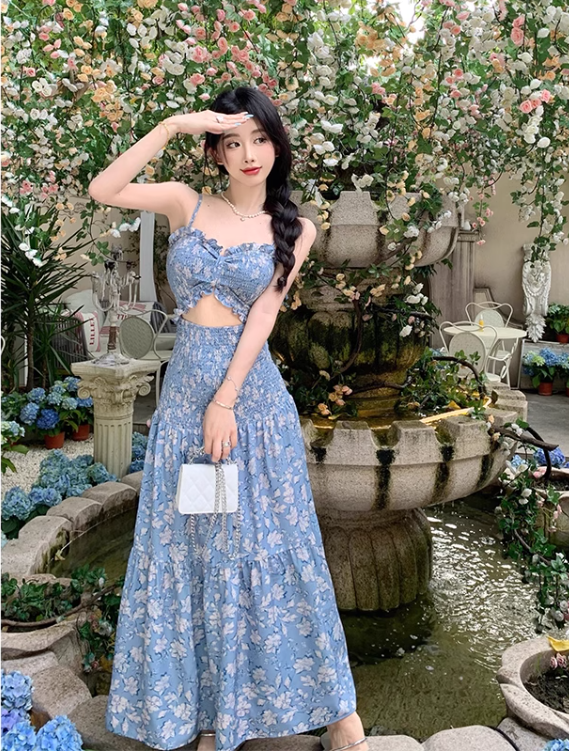 New Fashion Blue Floaral Design A-Line Spaghetti Strap Dress TP3045
