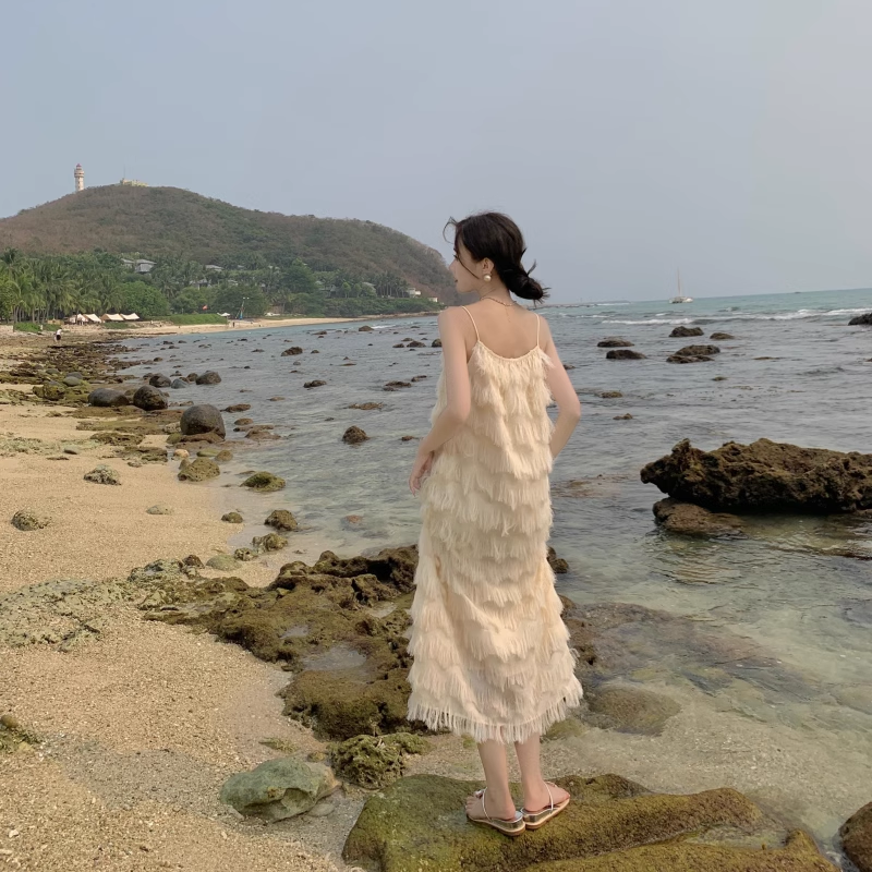 New Fashion Tassels Design Pink Beach Elegant Spaghetti Strap Dress TP2965