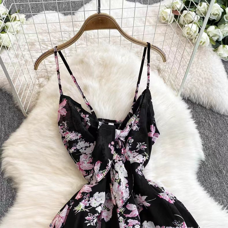 New Women Simple Fashion Spaghetti Strap High Waist Floral Dress TP2852