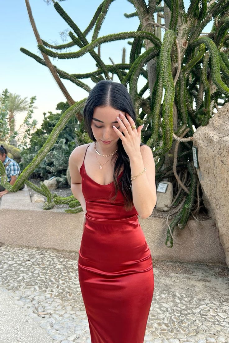 Simple Spaghetti Strap Burgundy Satin Long Mermaid Formal Prom Dress Evening Gown TP2368
