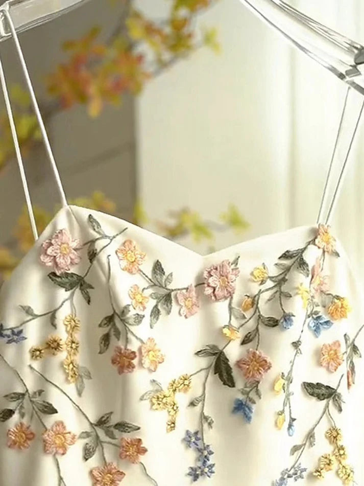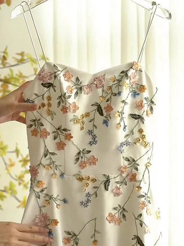 Vintage Beige Spaghetti Strap Floral Applique Design Elegant A-Line Evening Dress Prom Dress TP4107