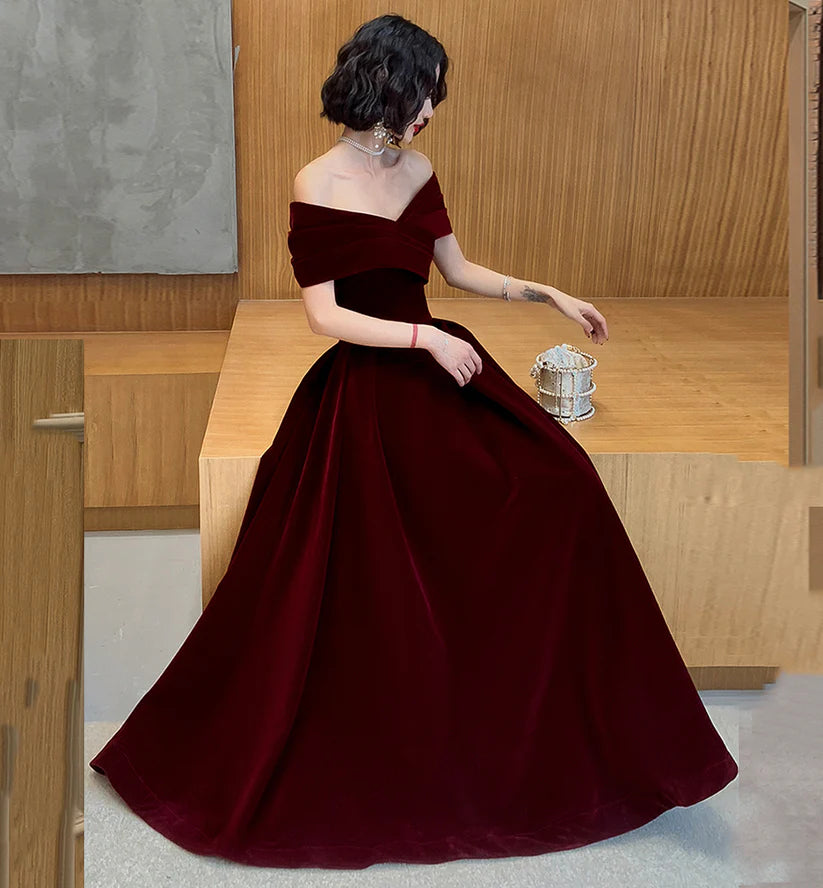 Vintage Burgundy Off-the-shoulder Velvet Design A-Line Evening Dress Prom Dress TP4129