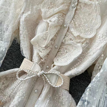 Vintage Elegant Crochet Embroidery Belt Design Single Breasted Flared Sleeve Long Dress TP2845