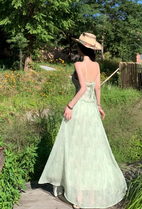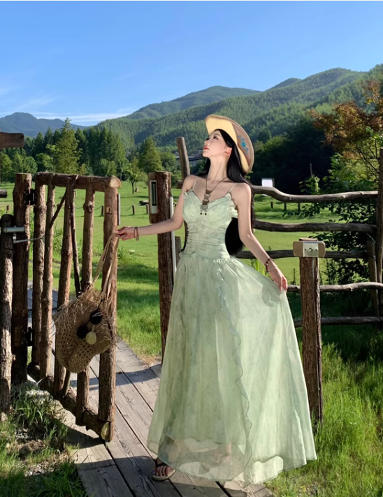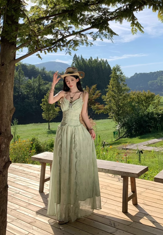 Vintage Fashion Green Irregular Ruffled Hem Design Elegant A-line Spaghetti Strap Dress TP3353