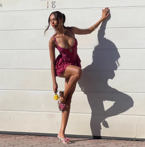 Vintage Fuchsia Lace Spaghetti Strap A-Line Short Tiered Party Dress Cocktail Dress Homecoming Dress TP4472