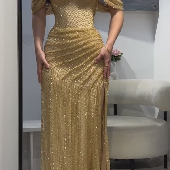 Vintage Golden Glittering Sequin Evening Gown Sheath Off-the-shoulder Party Dress Long Formal Dress TP4966