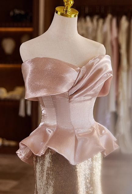 Vintage Pink & Rose Gold Glitter Satin Sheath Off-Shoulder Peplum Evening Gown TP5468