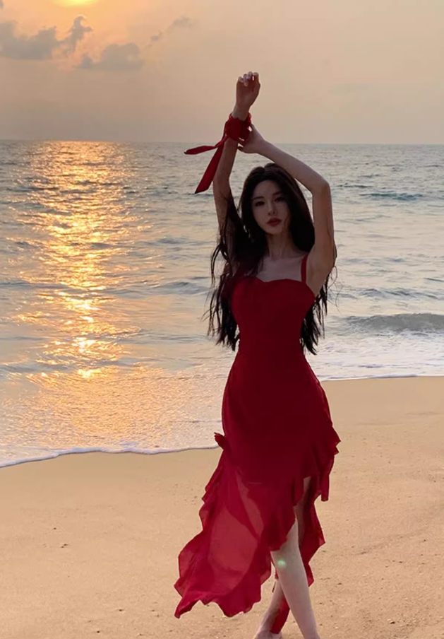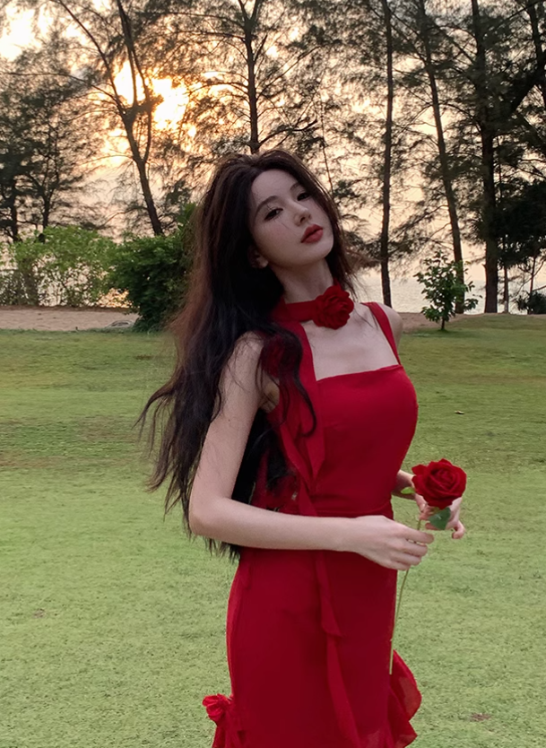 Vintage Red 3D Flower Irregular Hem Design Chiffon A-line Spaghetti Strap Dress TP3521