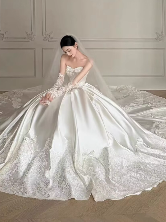 Vintage White Satin Applique Sweetheart A-Line Strapless Wedding Dress TP5031